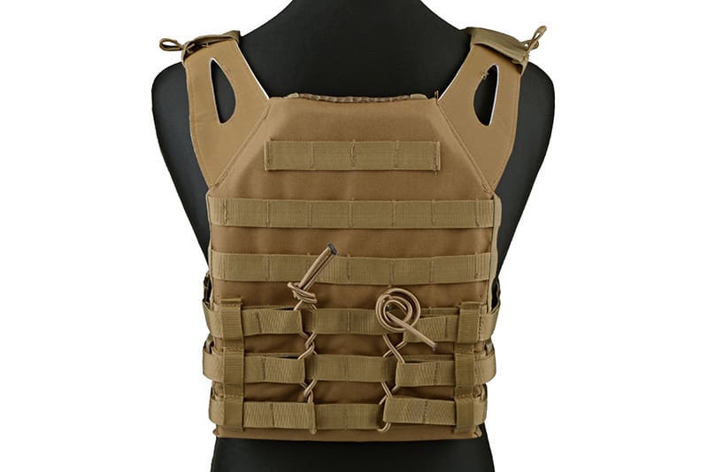 A very light and functional vest of plate holder made of durable nylon. It is made of two panels - front and back, which are connected with light skeletal leg straps, which are made only of stiffened straps. These straps can also accommodate additional accessories and bags.