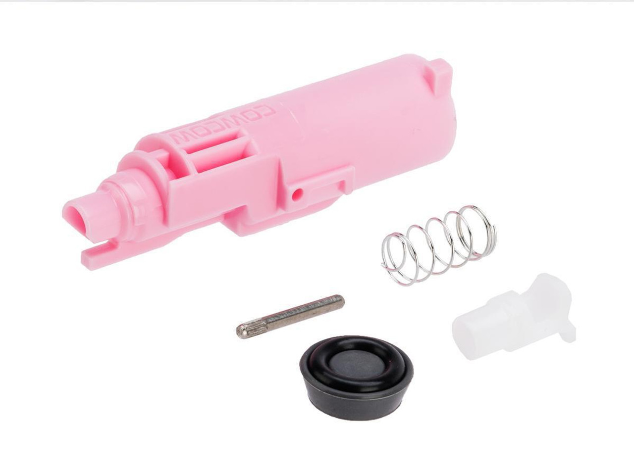 This complete polymer nozzle kit offers a more durable and resistant quality than the original part of the GBB Hi-cap pistol. Its design allows for better performance. The nozzle diameter is increased to 14mm and uses a new generation of non-rotating valve. Included: plastic nozzle valve, valve spring, nozzle, valve pin lock, 14mm piston head, and 1 O-ring with an internal diameter of 7.2mm and a thickness of 2.4mm. Compatibility: Hi-Capa type TM and 1911.Reviews