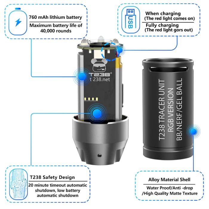 Functions: Rainbow tracer mode, dynamic gunfire color, tracer BBs/NERF darts/Gel balls charging, adjustable gunfire color, 20-minute timeout automatic shutdown, low battery automatic shutdown